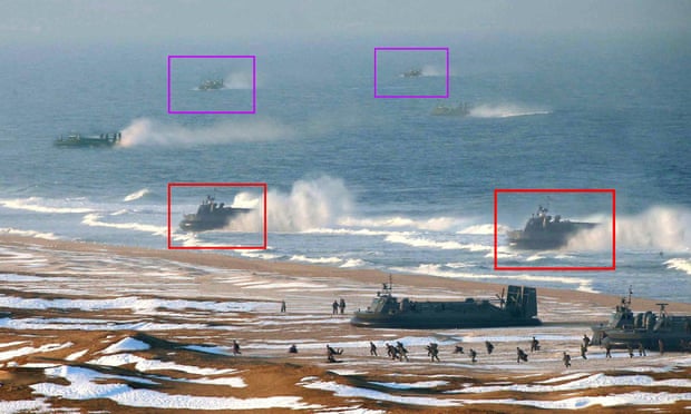 | Fig. 28 - A Photoshop Image (at least for The Guardian newspaper)? Eight Kongbang class assault ACV reach the beach in an amphibious exercice. (http://www.theguardian.com/world/2013/mar/27/north-korea-photoshop-hovercraft) |