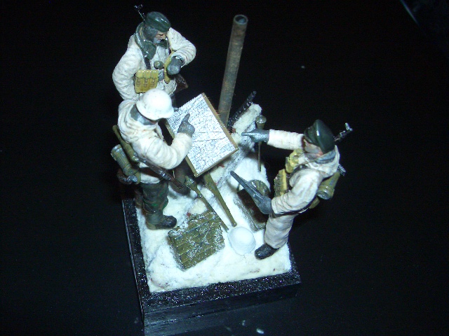 Face paint with white, black and flesh colour from Revell. Material like the canteens were painted with Winton oils. After the green uniforms and camouflaged (aplication of "washings" with two shades of green, first darker, then lighter and last the protrusions), come the gloves with a lighter shade of gunmetal. Then a first wash with Pebeo oils (burnt sienna) diluted in white spirit. Dry pastel with light and dark brown to the dirty uniform (the white uniform was with Neopastel of the same colour for the light contrast).