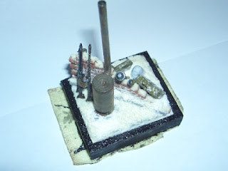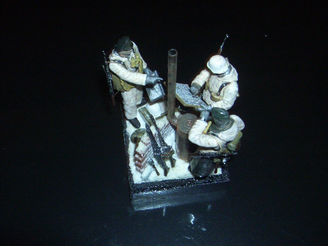 The next step was Tamiya stove placement, painted with the Revell gun metal and finishing using dry pastel Faber Castle, fixed with hairspray. Boxes of ammunition, mine, and grenades from Italeri painted Revell's with gun metal and Siena oils (burnt siena and and burnt umber). Helmet was painted with with white from Revell, and Italeri Panzerfaust with darkgreen no.65 also from Revell and "peeled" with gunmetal the same brand. After that comes the painting of the 3 figures ( Revell paint, brown-green, leaf dark and matte black).